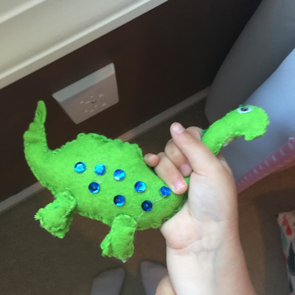 She did help me trim a few pieces, and she pulled the needle through the felt twice. But I did the rest, which is completely fine. She loved the dino when he was finished, and she was proud of herself for helping. He’s joined her ever growing dinosaur collective.