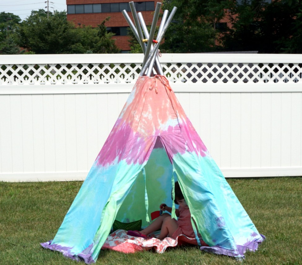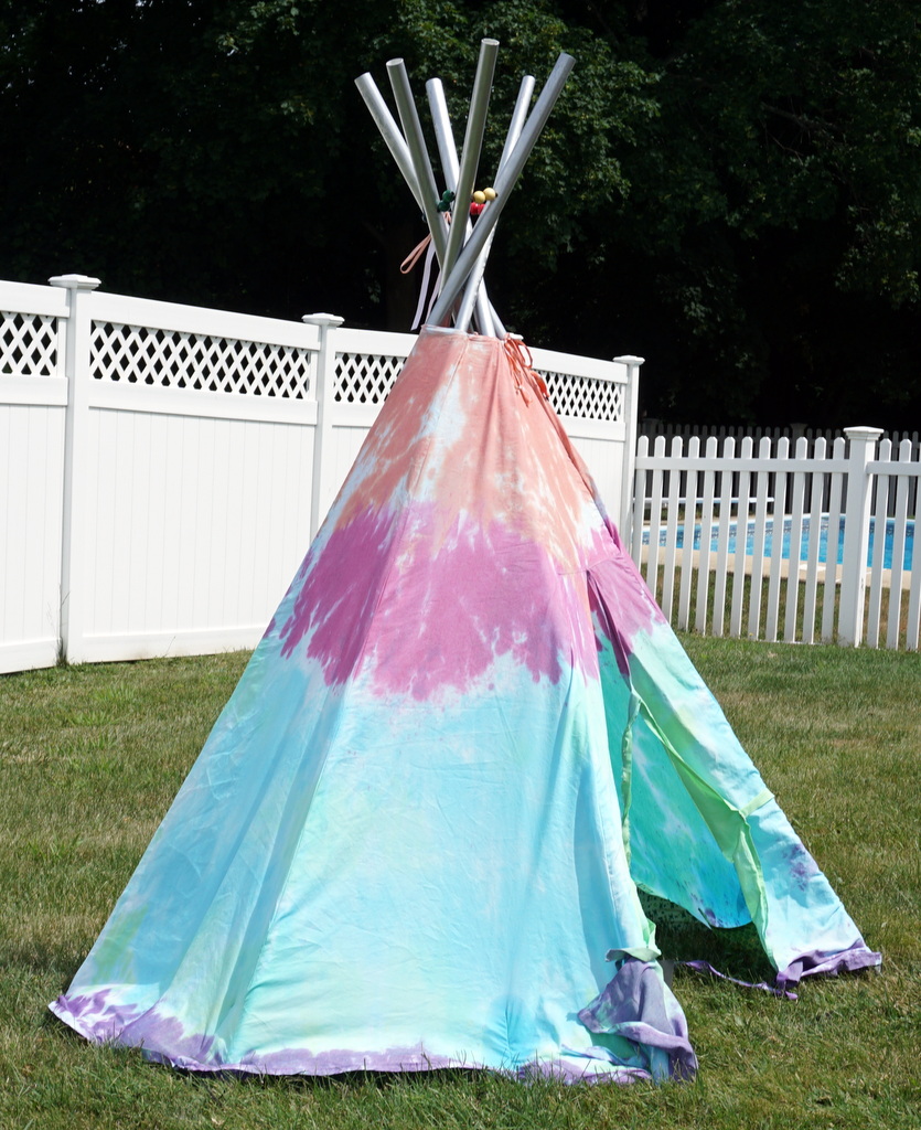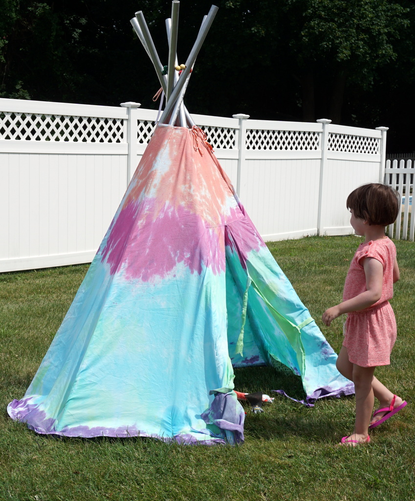 I bought a big tie dye kit on sale when I was stocking up on summer craft supplies, and then I pinned some great projects on Pinterest. And one of them was this I Love to Create Tropical Twist Teepee. I knew I could sew the tent and get H to help me dye it, and then she’d have something really cool for her backyard play. And we had so much fun! I love how this turned out.