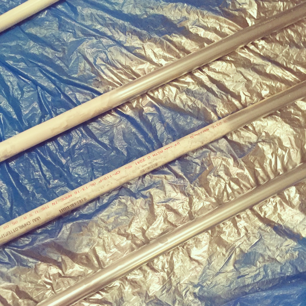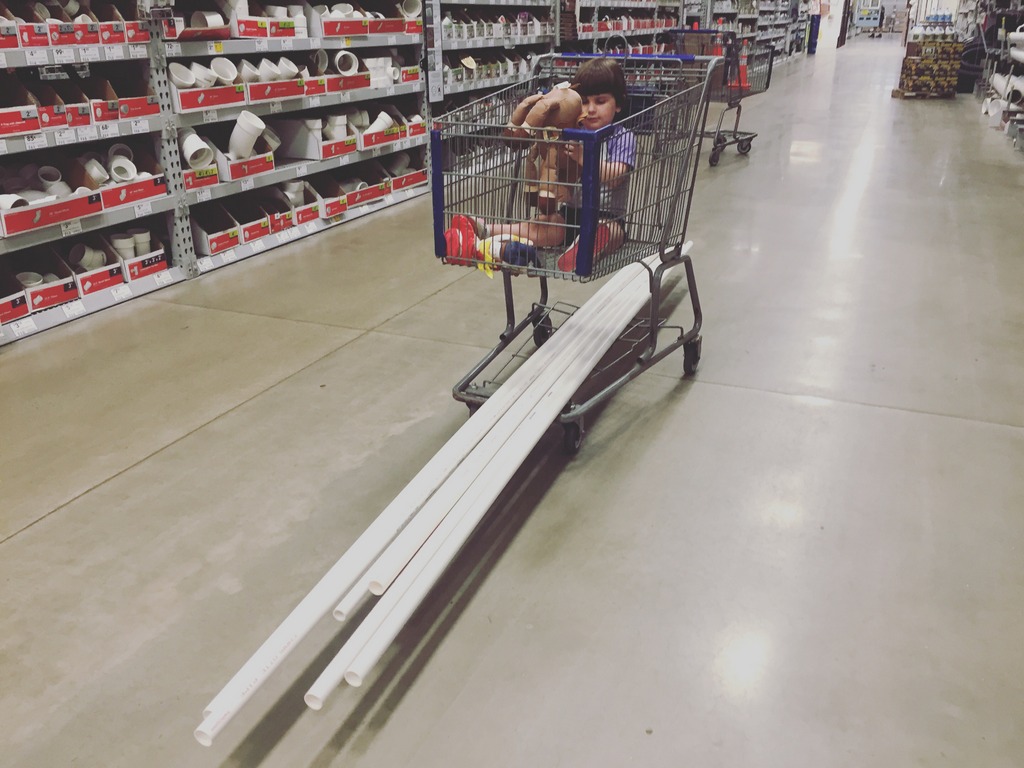 H helped me pick up $15 worth of 1″ PVC pipes. I’m not great with a hand saw, so Adam cut the pipes down to size and drill the holes needed for us.