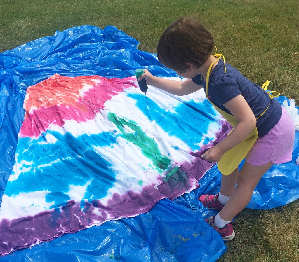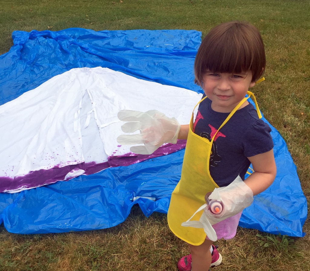 Then we “painted” the whole tent, and she loved it! I did the straight lines, she filled in the middle. We just did this on Friday, and there was a huge thunderstorm through most of the afternoon and evening. We got out at lunchtime and got this painted in the last sunshine before the storm. Then I wrapped it in that tarp and left it outside, I didn’t realize how much rain we would get. So some of the dye colors bled together before I ran out in the storm and brought the tarp back in the house for the dye to soak. We lost some of those great white spaces, which turned blue.