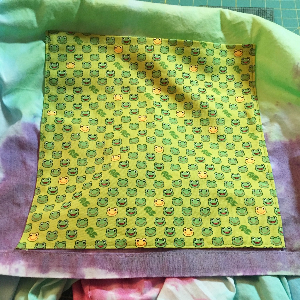 I love this frog print, I don’t know where it came from in my stash. But the pockets made a huge difference! Once I sprayed the poles, and tied them together properly, this tent was much easier to set up. And the water weights did the trick.
