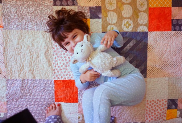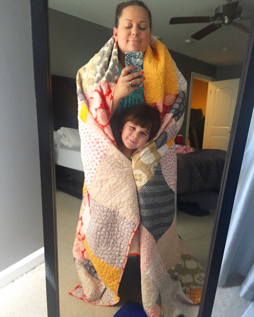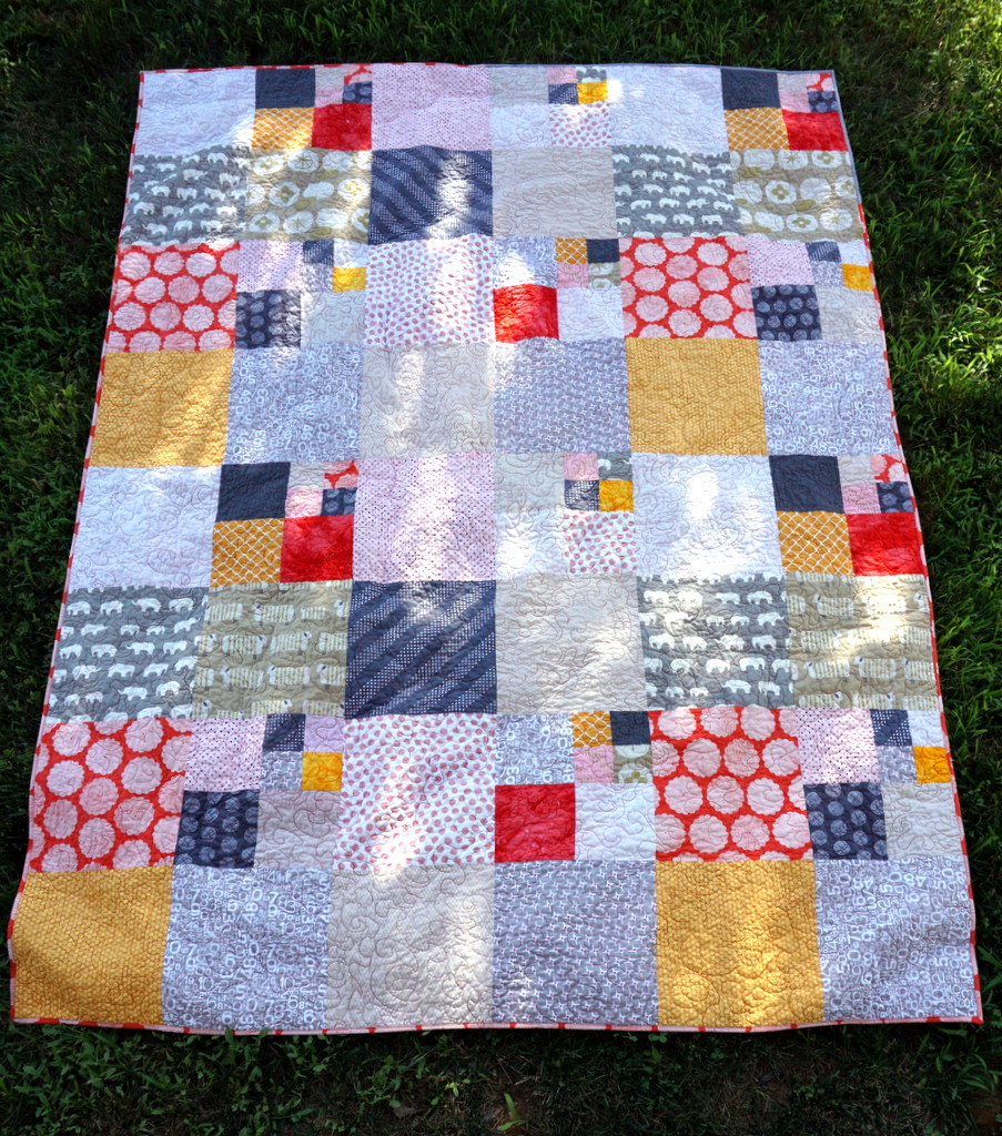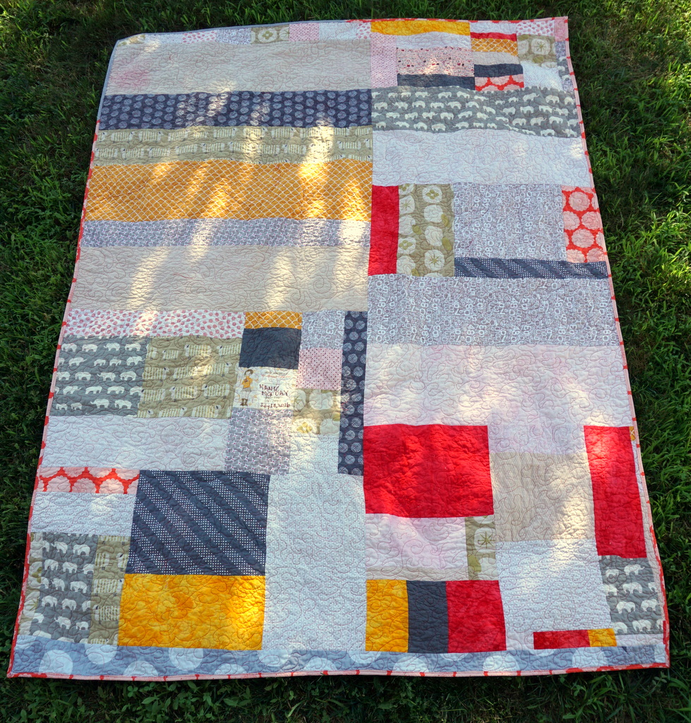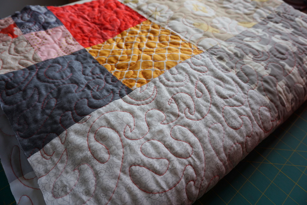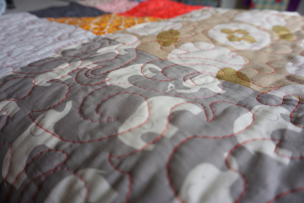 It gave me so many headaches during the process, though. There was the 12″ block I quilted and didn’t like, so I picked out all the stitches. And then, I didn’t make the backing long enough. This has never, ever happened to me before. So I finished quilting and realized only the backing was showing across the bottom sliver. I had to pick out all of those stitches, which took even longer, and then sew a strip onto the bottom of the backing and requilt that one section.