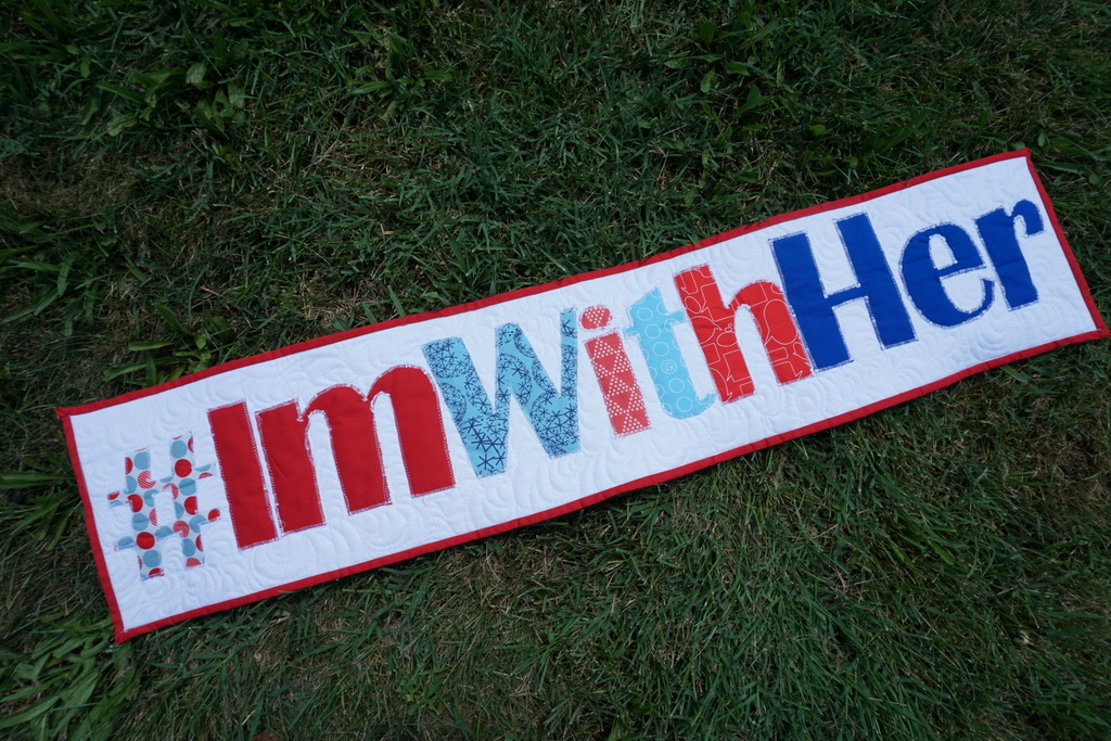 I’ve noticed that quilters–the ones who are prominent, well known, with Instagram feeds I aspire to myself–don’t talk about politics. My guild friends talk about it nonstop, but the community at large seems to be pretty neutral. Many of them talk about issues, and man, do we have a history of tackling some issues with fabric and thread. But less specifically about politics and candidates (even if those issues are loaded, politically). I have this sense that it’s something that’s just not done in the professional world of quilting, and I kind of straddle both professional and not. So when I had this banner idea the other night during the DNC, I suddenly got nervous and almost didn’t make it. I’m trying to build something here with my quilting, and I wondered for about 5 minutes if this would be a bad idea.