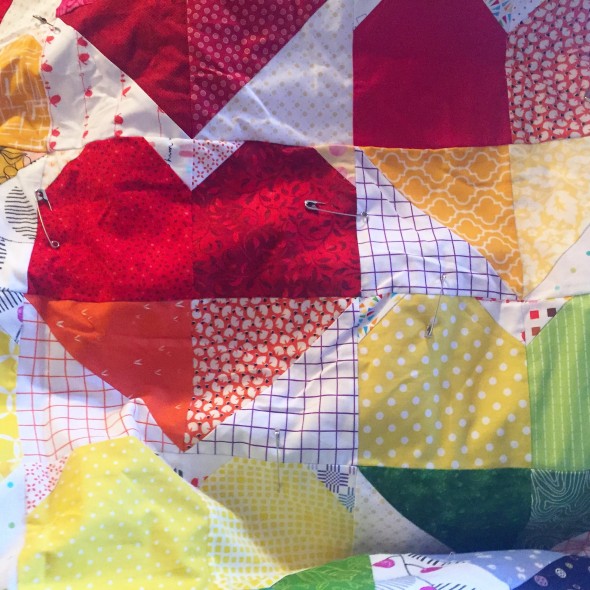 The Orlando Modern Quilt Guild has been running a drive this summer to collect rainbow quilts for the victims and family members of the Pulse nightclub massacre. My guild is participating. Some phenomenal women pieced together these heart blocks, contributed by members, and then they sent it to me to quilt it.