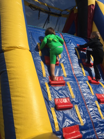 She was so determined to pull herself up this wall, it was impressive. Everyone was sliding down the wall, even the big kids who could scramble up faster. She got landed on more than once, and I asked her if she wanted me to lift her over the wall and take her out. Nope, she wanted to do it. For a good five minutes she fought to pull her way up, even handing me her socks at one point to try a different tactic. For my little OT kid, it was pretty awesome. She was so excited to get to the top that she just sat there for a minute blocking the slide on the other side to take it all in.