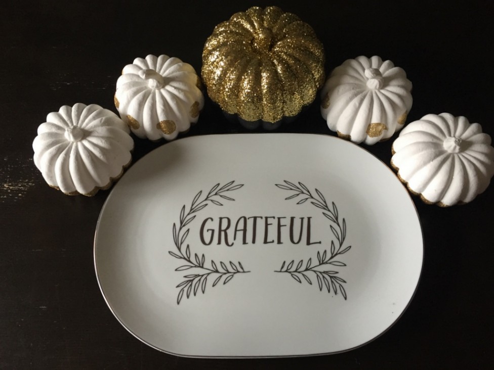 I made these disco pumpkins as a centerpiece for our dining room table to celebrate Thanksgiving. I bought that platter at Target when the fall stuff first came out, and I love it. And, I thought it needed something with gold sparkles to sit with it. I made this video so you can have disco pumpkins, too!