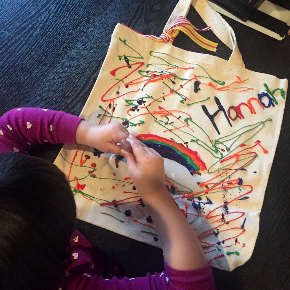 H got the tote bag kit in that photo above from her Uncle Thomas. We made it at the end of Christmas week, after NYE, when things had calmed down after all the family visits had happened and presents had been unwrapped. After she’d played with toys and we started organizing and getting things into their new homes, she really wanted to dig into the kits and make something. So we parked at the kitchen table and made this bag together. A complete project, that my sensory, hypotonic four-year-old loved and had an absolute blast decorating the way she wanted it. There were fabric sheets in the project box, too, but she just wanted to paint her heart out. It was exactly what she needed after a great, busy holiday week to help feel like she’d really finished something.