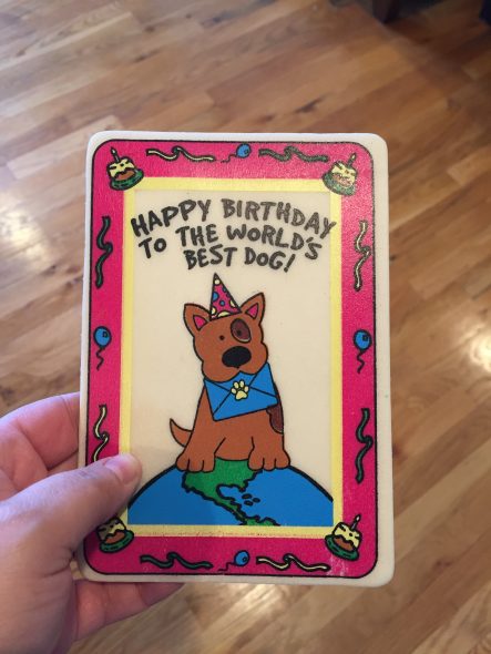 Then we took him to Petco, and let him pick out a new toy and some treats. We also got him a jumbo bag of the peanut butter Blue Dog Bakery Softies, which are his complete favorite. And, this edible doggy birthday card.