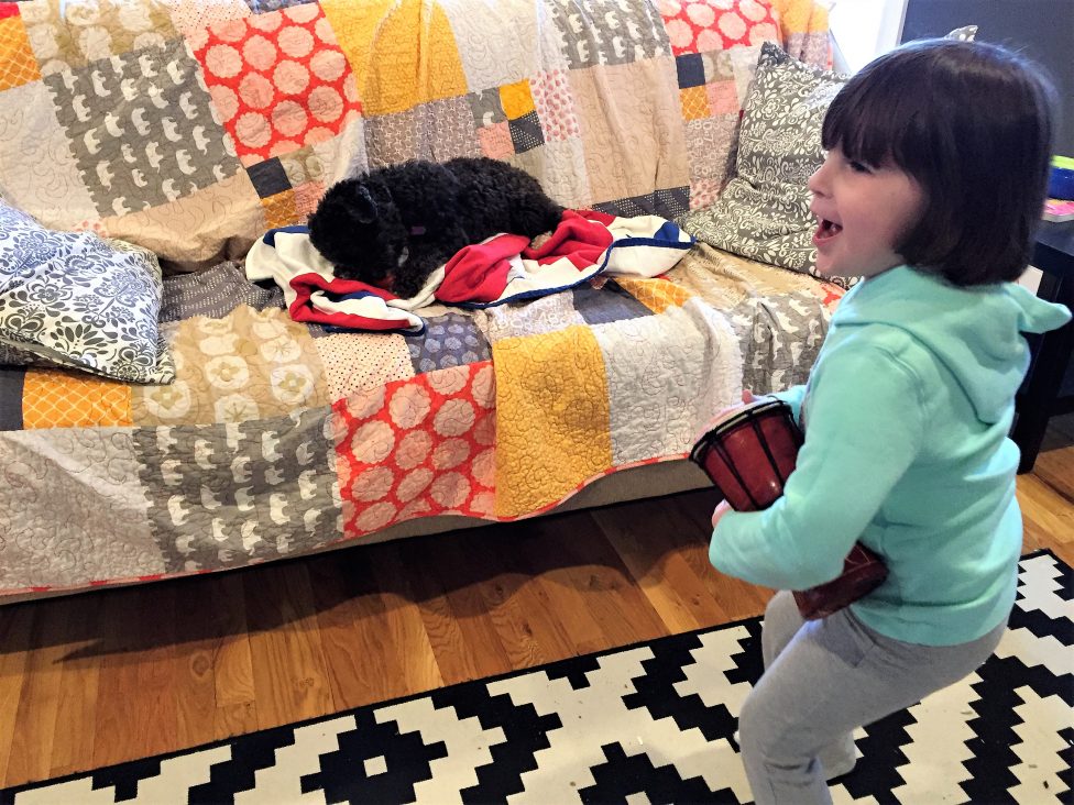 This was before he went to the groomer. His groomer visit was actually part of his birthday present, we sprung for a deep conditioning treatment and everything. On the actual day, H picked out this giant Bubble Guppies balloon for him, since it had Bubble Puppy. She thought he’d like that.