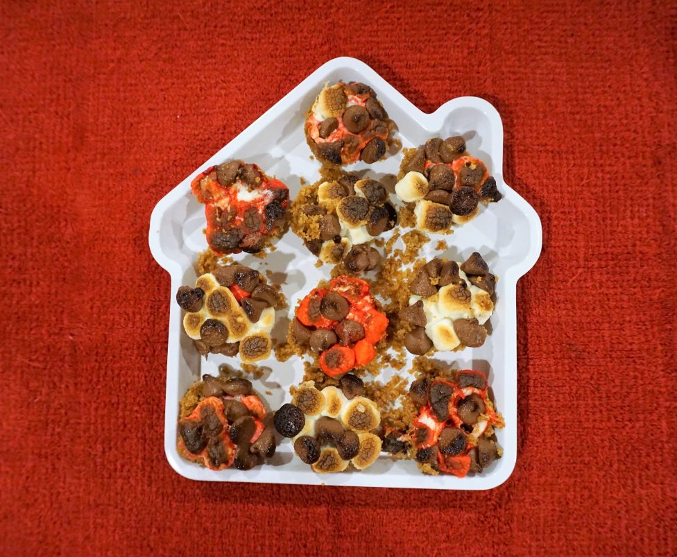 I started with this recipe for S’Mores Cups from The First Year, but I didn’t follow it exactly. I didn’t add any sugar to the graham cracker mix like the original recipe does, and I probably used more crumbs in the base layer for each cup. The original has enough crumbs to make several layers of crumbs mixed with marshmallows and chocolate chips, but I just did one pass with each. It was basically a graham cracker cup filled with some marshmallows and chocolate chips, just one layer. We also used food coloring to dye some mini marshmallows pink and red, and I only made one layer. They were very crumbly because I could not wait 15 minutes to take them out and try one, but they were still pretty delicious. So, here’s what we did: