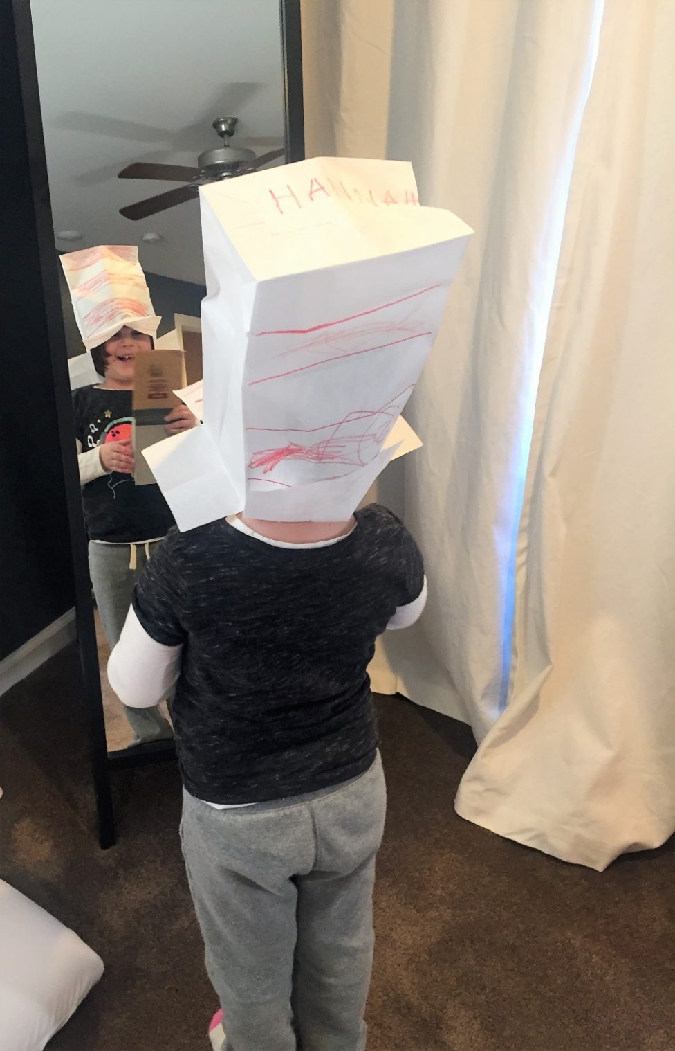 I drew off some quick lines, and H colored in some red stripes. The hats take hardly any time to make, which was ideal for a sensory kid who just wanted to squirm and run today. I had some other ideas planned, since the hats get made pretty quickly (this depends on the kid, though. Some kids race through, others take a solid 30 minutes to meticulously color the lines). My kid raced. I cut a slit in all 4 corners, folded back the opening of the bag to make a hat brim, and voila! Cat in the hat hats.