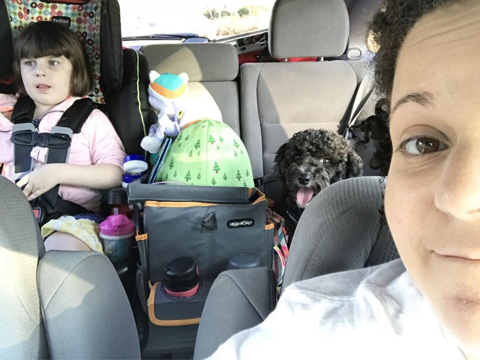 And then another pit stop down the road. We made it to a grocery store not far from our hotel at 8pm, and we picked up some supplies before we checked in. My original plan was to check in a few hours earlier, leave Hamilton in his crate in the room, and run out to get supplies and dinner. That did not happen, but we made it work. This girl didn’t seem to mind too much.