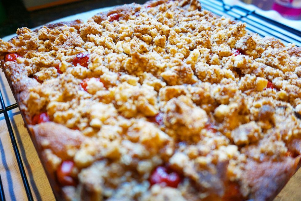 But here’s the crumb cake recipe! I’ve linked to the original but posted below with the ingredients I swapped out. The texture was still fantastic, and if there’s one flavor that goes so well with sour cherries, it’s almond. You could probably swap out the flour completely, but I’m still experimenting to get it right.