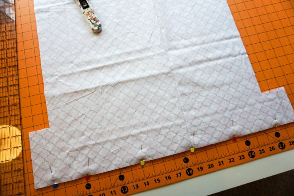 On your cutting mat, lay down your batting and then your inner and outer fabrics, right sides facing each other. Pin it, and then cut it down to a 24.5″ wide rectangle. I actually used half yard and big scrap pieces, so I let the height stay the full size of those pieces while I whittled away at it.