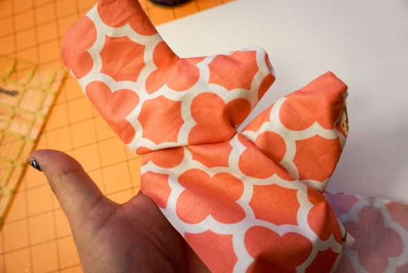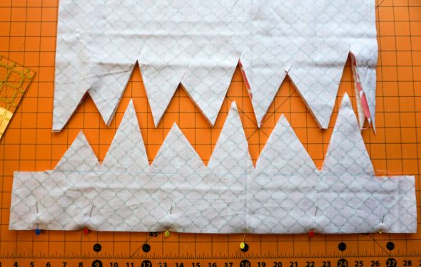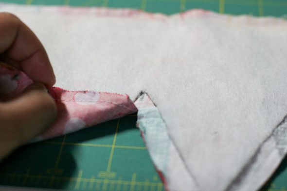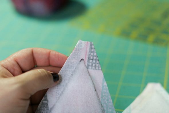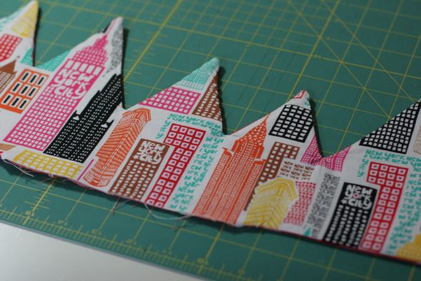 To make turning the project out easier, cut a notch into the space between peak, leaving about 1/8″-1/4″ from the seam. This just gives those crevices more flexibility when you turn them right side out.