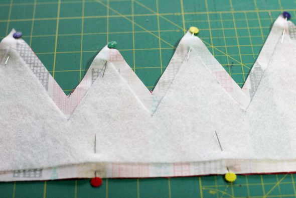 Now this is where you might find you like a template method better, but I don’t doing this. Unpin the batting layer from the crown sandwich, and use a ruler and a rotary cutter to remove 1/2″ off of every side, including between the peaks. You want it to be 1/2″ smaller than the fabric layers everywhere.