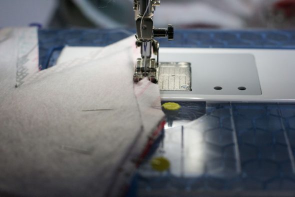 Sew all the way around the sides and the peaks of the crown using a 1/4″ seam. But leave most of the bottom edge open to turn the project inside out, only sewing a few inches in to the left and to the right.