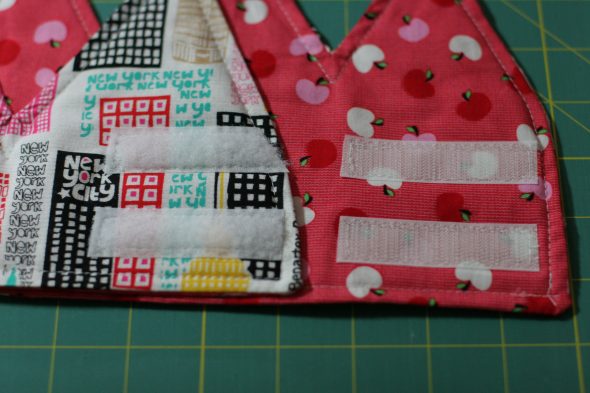 Once the crown is closed, cut two sets of velcro strips 3″ wide. Attach both hook sides of the velcro (the fuzzy side) to the front of the crown on the right. Pin the strips about 1/2″ in from the side, in parallel lines, and sew around the perimeter of each piece to attach the velcro. Then attach the loop pieces of the velcro (the rough halves) to the back of the crown on its right side. When the crown is laid flat, there should be velcro on opposite ends of the crown, one in front and one in back.