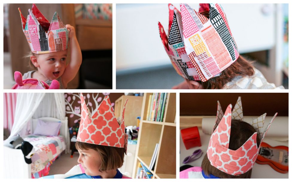 Some form of stiff stabilizer to make the crown stand up. I’ve used 1/4 yard of fusible fleece interfacing for this project, but I’ve also made them with regular quilt batting that I spray basted  to one of the fabric layers (which is what I did for the crown I made this week). You can totally use felt or even card stock. Fabric alone won’t stand up tall and stately.