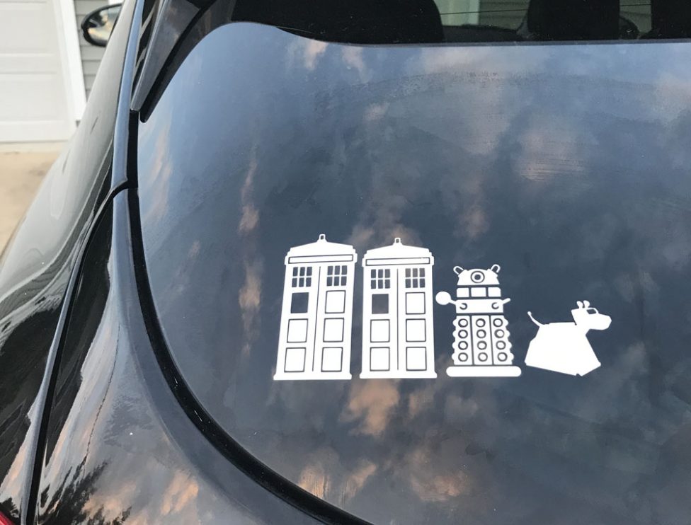 I got a new car at the beginning of the month, and I traded in my old car’s Thinkgeek Star Wars decals for some Doctor Who decals I made at home.