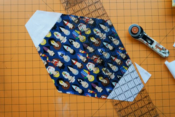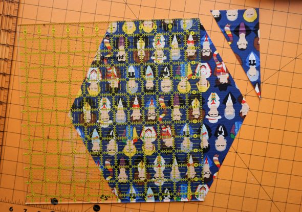 So then, I cut from the center point on each side to the 3.25″ point to make the square into a heptagon.