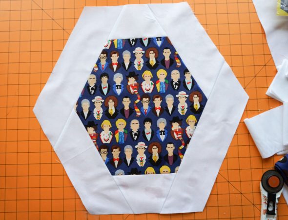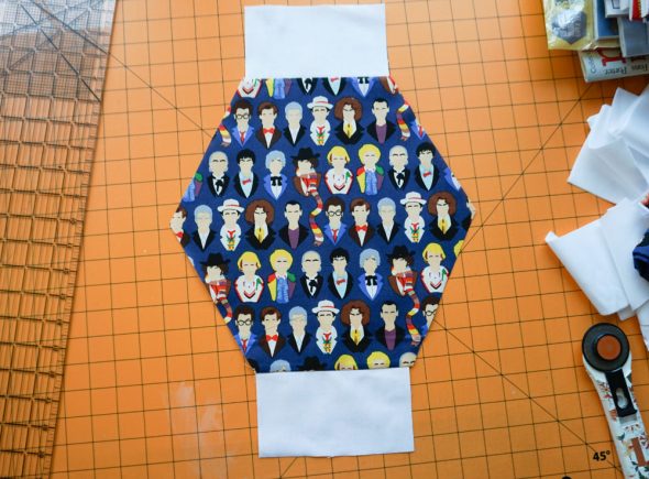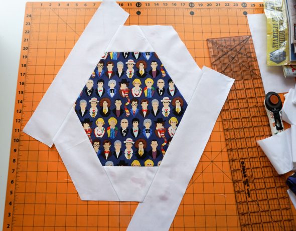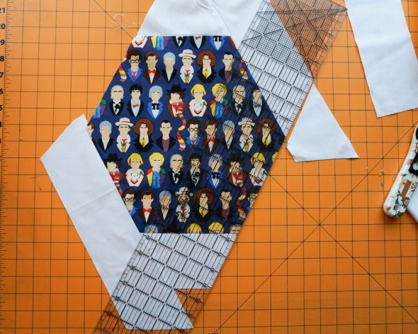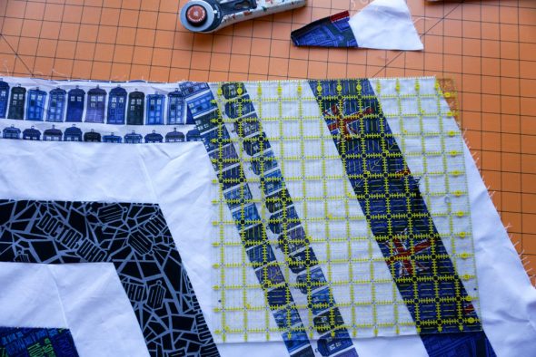Then when that layer was done, I went back in with another print layer (that blue and white TARDIS print from Spoonflower), top, bottom, and corners (I didn’t measure the corner strips, just made them long enough that I’d have plenty of room to trim them down when it was time to square up).