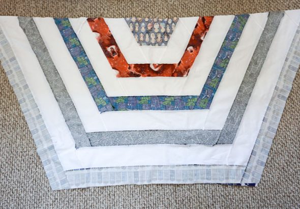 Once I’d added those final layers to the corners, giving this top a center print and then 11 rings in total (including the clipped corners), I began squaring up the entire quilt top by trimming down the top and the bottom of the quilt.
