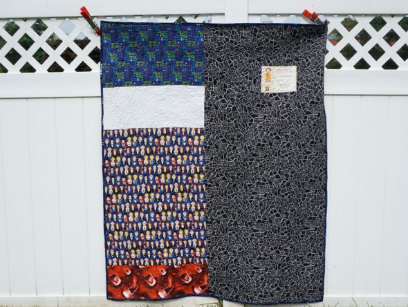 Then I sandwiched it, pinned it, quilted it, and finished off the binding with a flannel Who print I had from Jo-Ann.