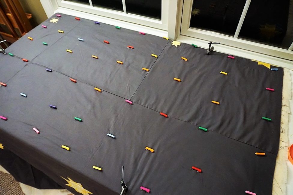 This is a big quilt, and you can see the end of the yellow backing through that batting above (I hadn’t trimmed it down yet). But it doesn’t have to be centered on the table, as long as it gets centered wherever you put your pencils. Mine are that discolored area over to the left, near that clamp on the table’s end.