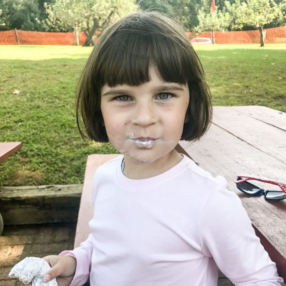 The best thing about Delicious Orchards in the fall is the fritter shack. Oh, man. The fritter shack. We have been back several time for their powdered sugar donuts (seen above all over H’s face) and the fritters. Which are possibly my favorite fall thing about living in this area.