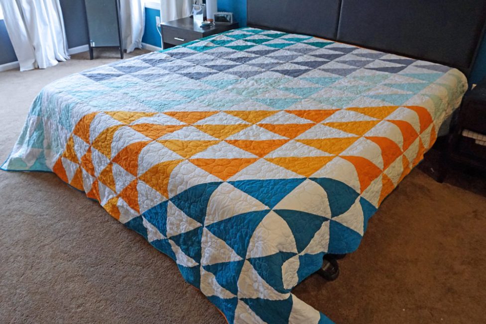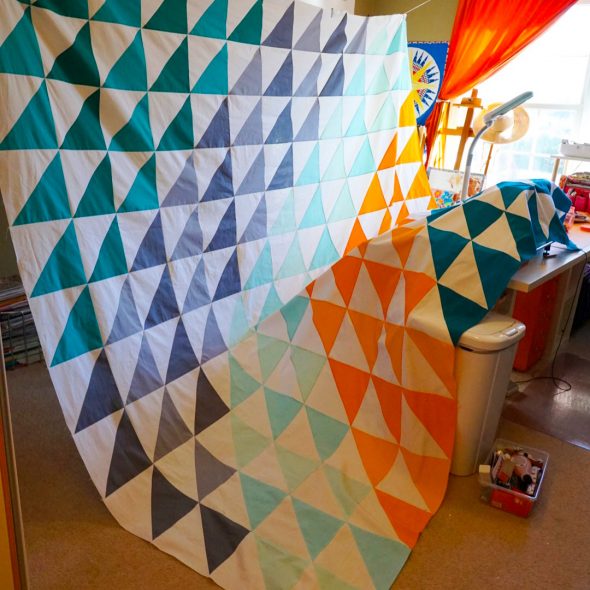 This king size quilt is made of 100 half square triangles, 10 rows of 10, 9″ finished. This is the biggest quilt I’ve ever made, by a mile. And it’s all Kona solids. Two shades of turquoise, two shades of gray, two shades of mint/pale blue, two shades of orange, two shades of teal, to give it kind of an ombre look.