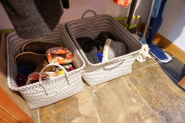The closet is full of more coats, cleaning stuff, other seasonal gear. These two baskets on the floor hold all of our gloves, hates, flip flops, any other seasonal supplies we want to keep out of the way. One for me, one for Adam.