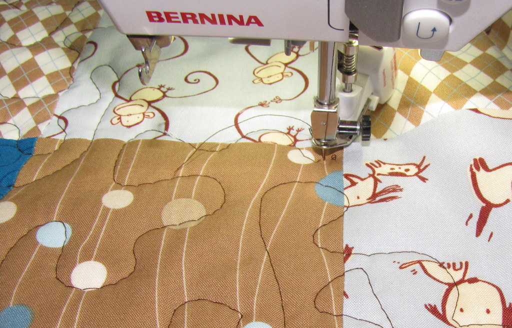 I have finished the quilting on this one, now I just need to snip threads and bind it. This is the first time I’ve played with the Bernina Stitch Regulator, and I love it. Took a while to get a groove going, but once I did it was great. I just did a meandering quilt pattern all over in chocolate brown thread.