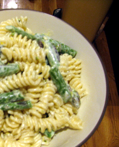 pasta with goat cheese, lemon, asparagusThis is a rich, delicious pasta dish for a rainy summer night from the June issue of Bon Appetit. The goat cheese really brings out the lemon flavor, and I was surprised how much I liked the asparagus cooked in the pasta water (usually I just like it grilled). I actually added some cooked, crumbled bacon pieces to the top to cut the rich flavor. My batch was uber-lemony, and this might be because I used some of my lemon olive oil in this dish. Next time, I’ll stick only to the lemon peel. It’s plenty of flavor in this dish.