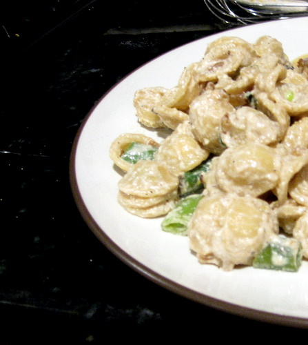 Orecchiette with Caramelized onions, sugar snap peas, and ricottaThe only thing wrong with this recipe from the June 2009 issue of Bon Appetit is how much trouble I have spelling “orecchiette.” I made this a few weeks ago to go with the Pork Cutlets Piccata. It’s a vegetarian option that could be a meal all on its own, and it’s delicious.