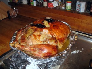 So this is a turducken. Our friends Dan, Ken, and Laura Ann threw this Thanksgiving in July party at Dan’s house yesterday, and it was pretty much so they could showcase this turkey/duck/chicken concoction. We waited with baited breath for hours while this thing roasted away (a bacon explosion helped pass the time), and just before we left for Christmas in July Adam and I got the first bites of it. We only got as far as the turkey layer, but it was yummy. I was a turducken skeptic, I have to say I was surprised to find it was delicious. All that duck fat made it really moist. And neither of us got salmonella poisoning, so that’s a huge bonus!