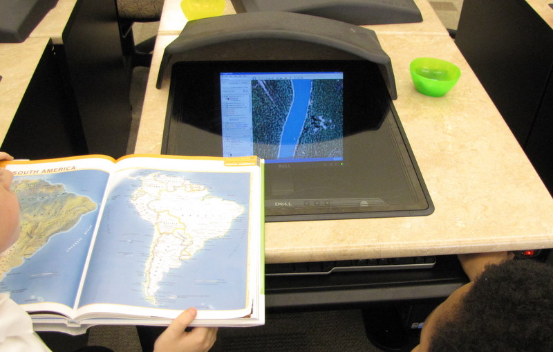 This unit actually started at the beginning of November, but since that’s such a short month for us I planned it to take up the rest of the calendar year. I began by having all the 4th graders in each class gather around my computer at the circulation desk. I showed them the basics of how to use Google Earth. We learned how to type in locations, how to zoom in, how to check off the 3D layer and other fun layers. We looked at our school and then at some famous monuments.