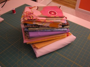 Joann Fabrics was having a 40% off sale on all calico prints through today. I went last night and stocked up on some great prints, it took the sales lady almost half an hour to cut all my bolts. I was so excited I took this fuzzy and discolored picture of my triumphs. It’s arty.